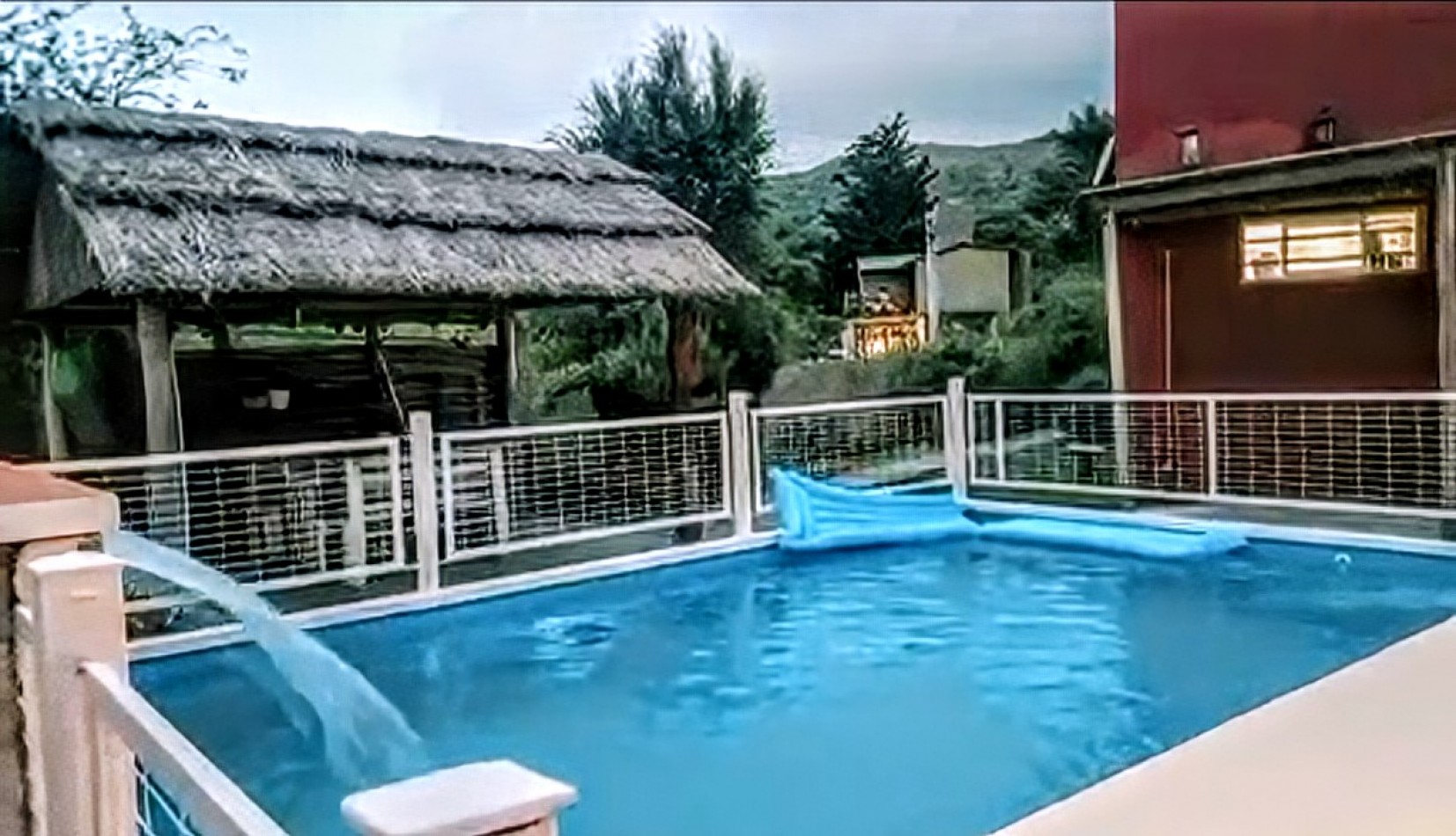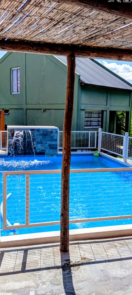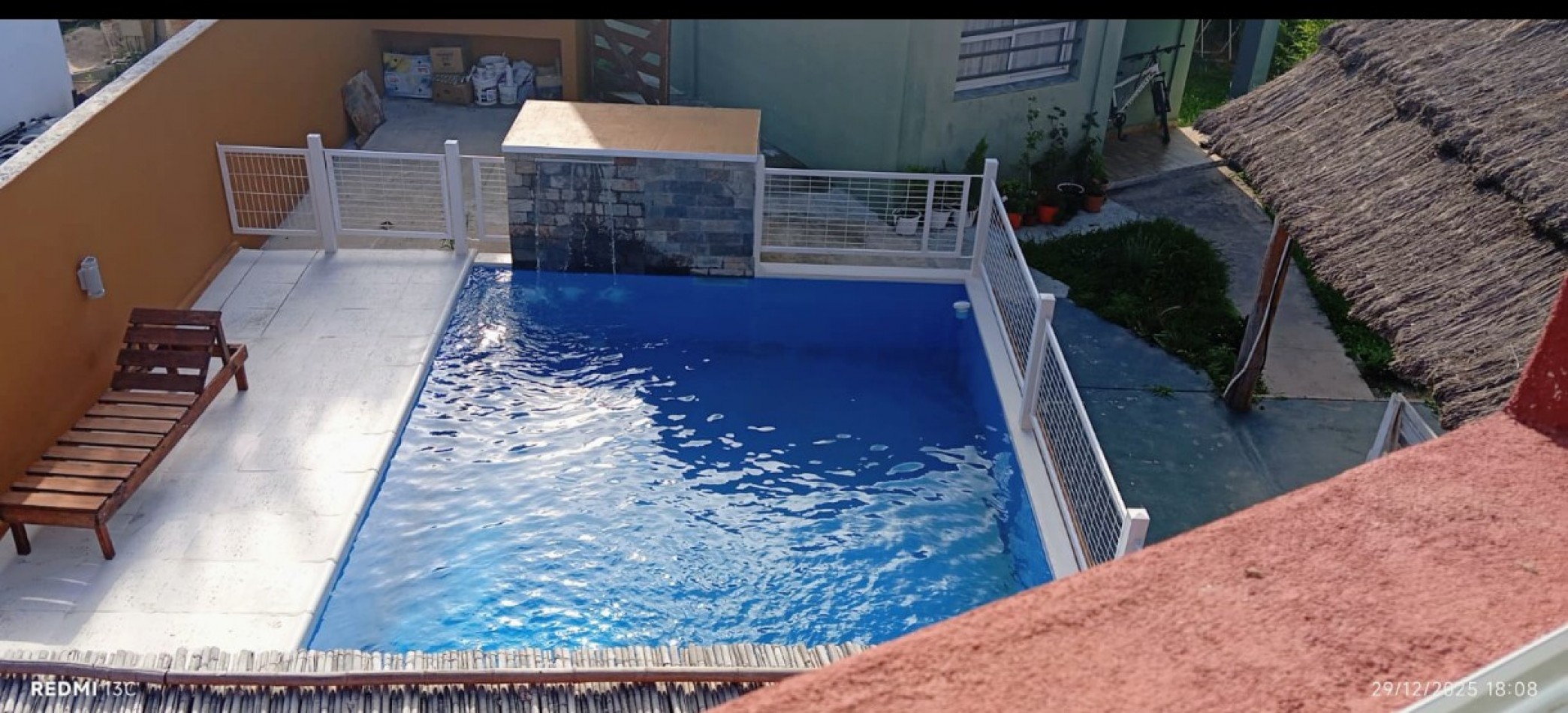 * Pileta con cascada, camastro y cerco perimetral, rodeada de espacio verde.