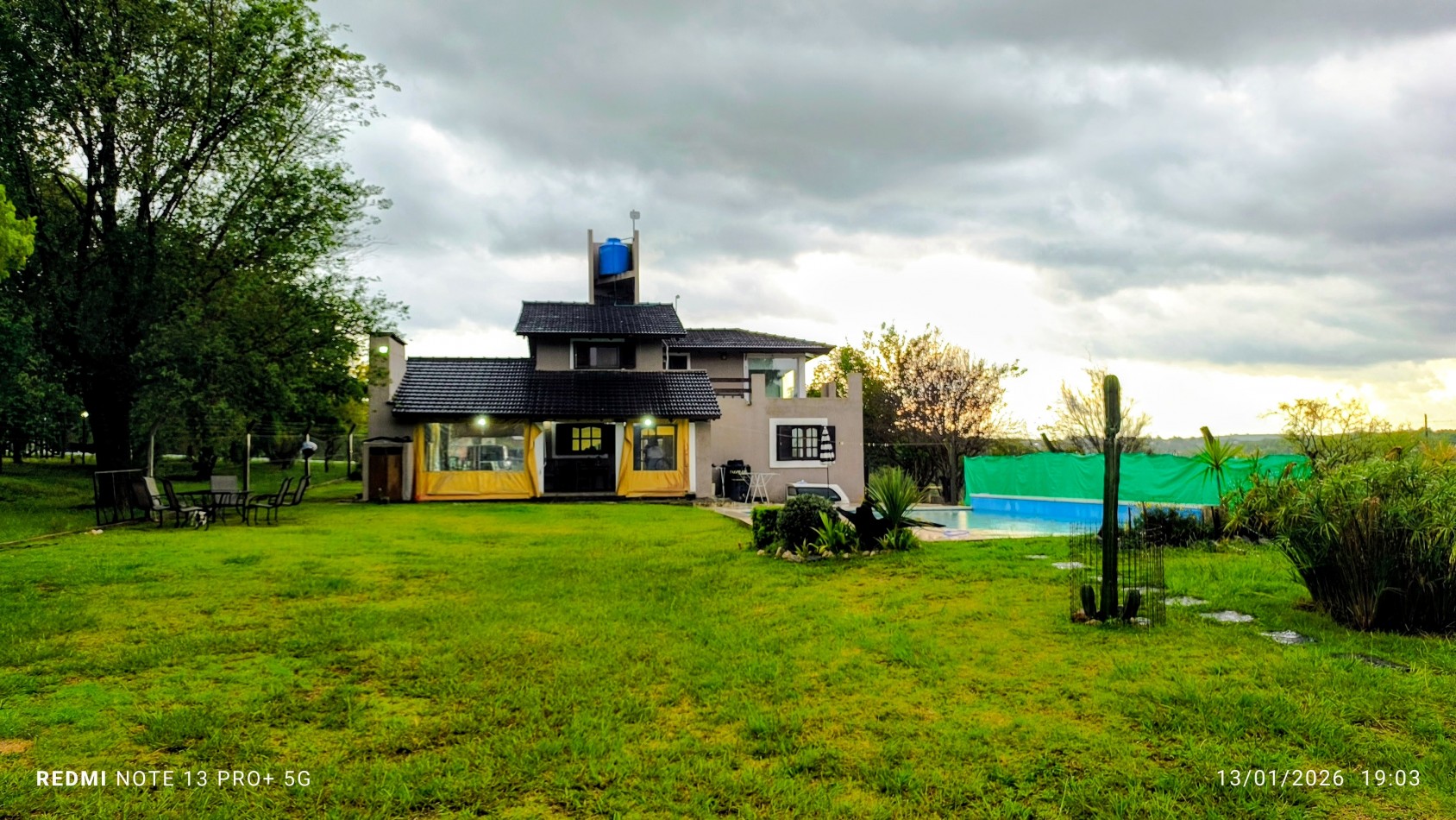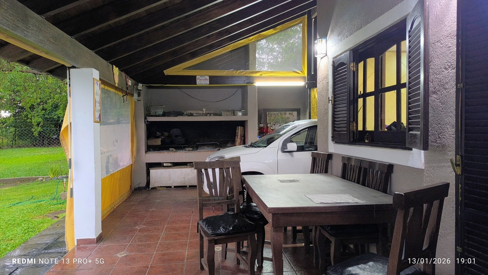 Quincho con asador, con cerramientos de lona, ideal para disfrutar todo el año.